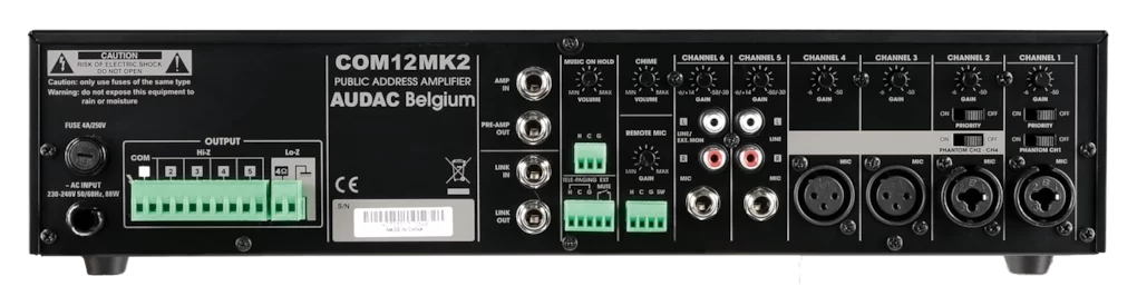The Audac COM12 is a Public Address Mixer Amplifier, with an output power of 120W to 100V constant voltage or low impendance (4 Ohm). Features Six input channels with individual level control, four balanced microphone inputs (XLR) containing Phantom Power, and two inputs selectable between stereo balanced line in and microphone. Highly efficient, multi-channel public address mixing amplifiers of this nature, provide the ideal solution for small-to-medium sized commercial sound systems.